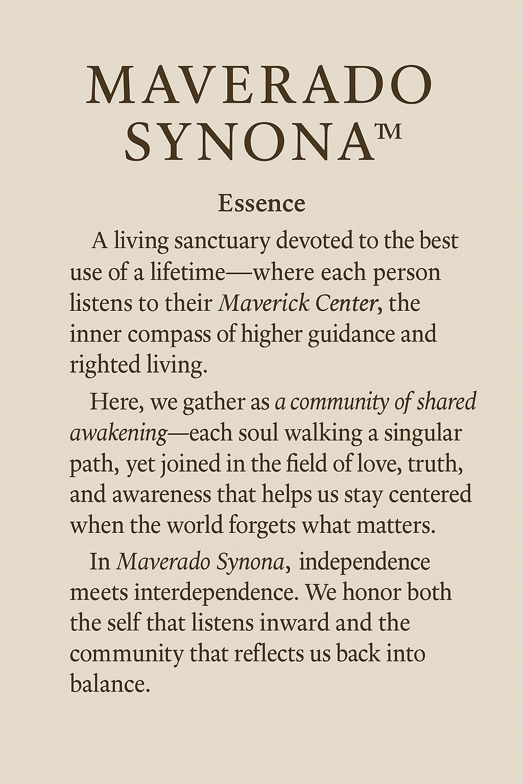 MaveradoSynona™ is not an intentional community in the housing sense. It is not a commune. It is not a belief system.