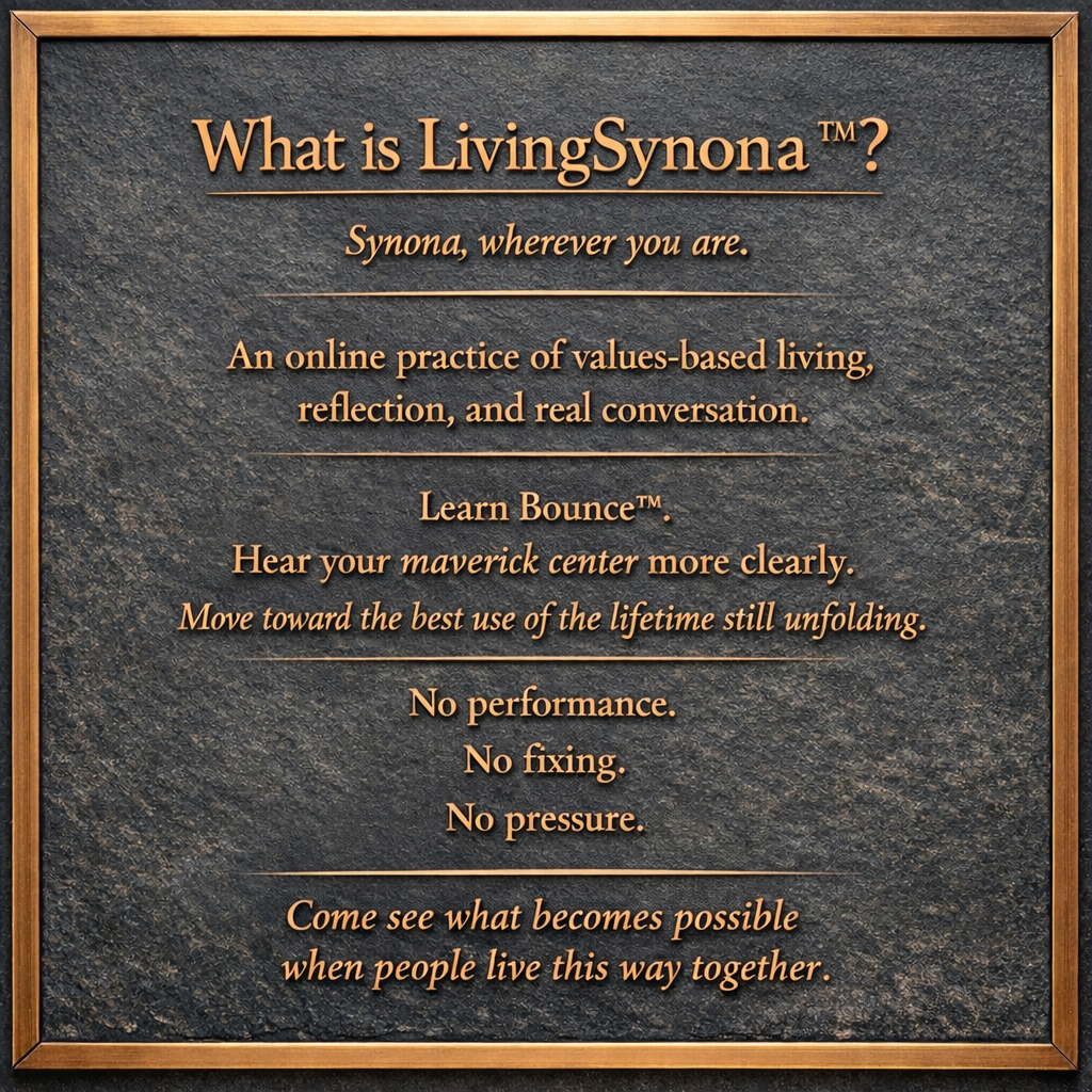 LivingSynona™ is the online extension of MaveradoSynona™ — a structured, values-based community for individuals who want to strengthen self-governance, reduce drift, and make the best use of the lifetime still unfolding.